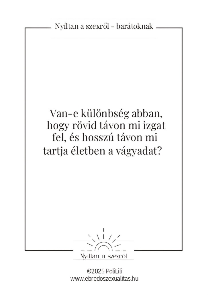 Eleinte lehet, hogy furcsa lesz őszintén beszélni magadról — ez normális. A legtöbb pár 5–10 perc után ráérez, és kinyílik. A kártyák segítenek „keretbe” tenni a beszélgetést, így elkerülhetitek az üresjáratokat, vagy a túl direkt, túl durva irányváltásokat.