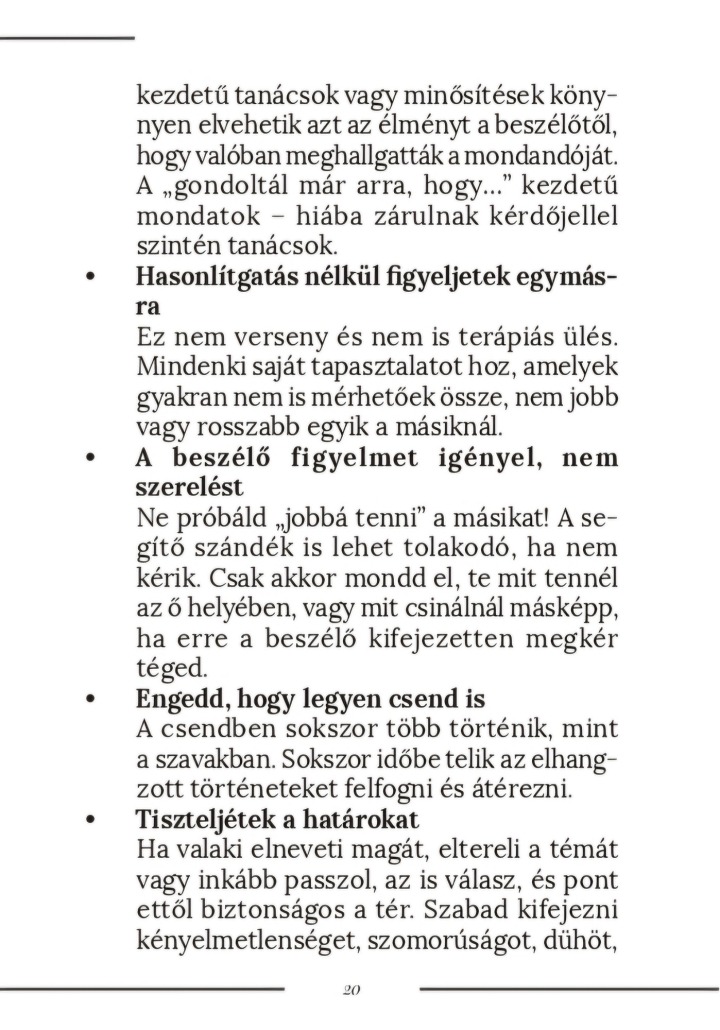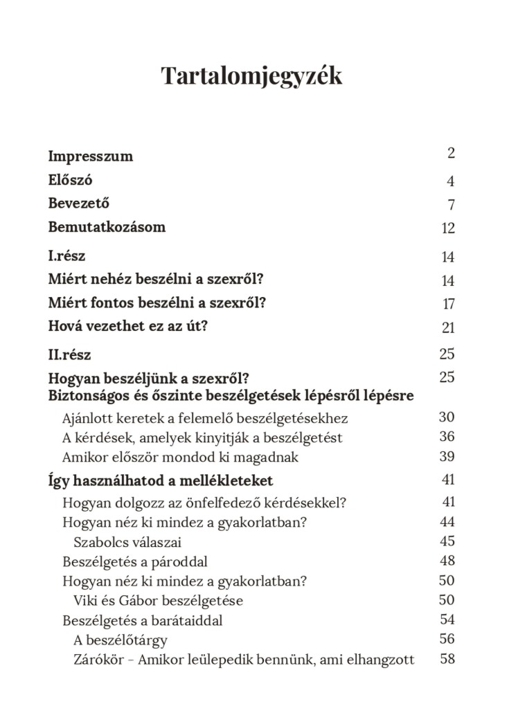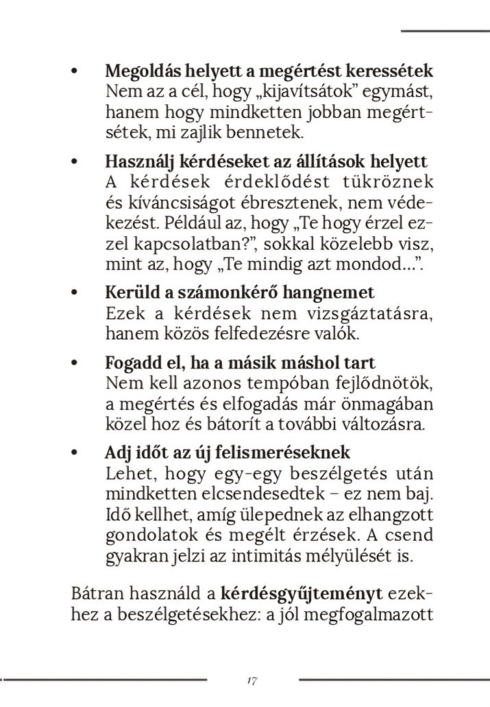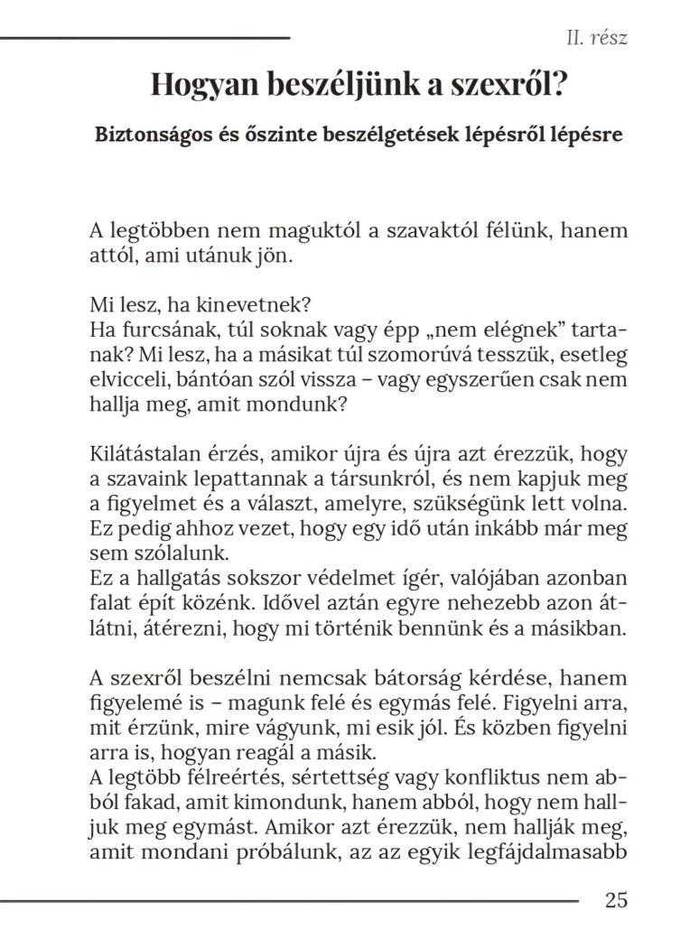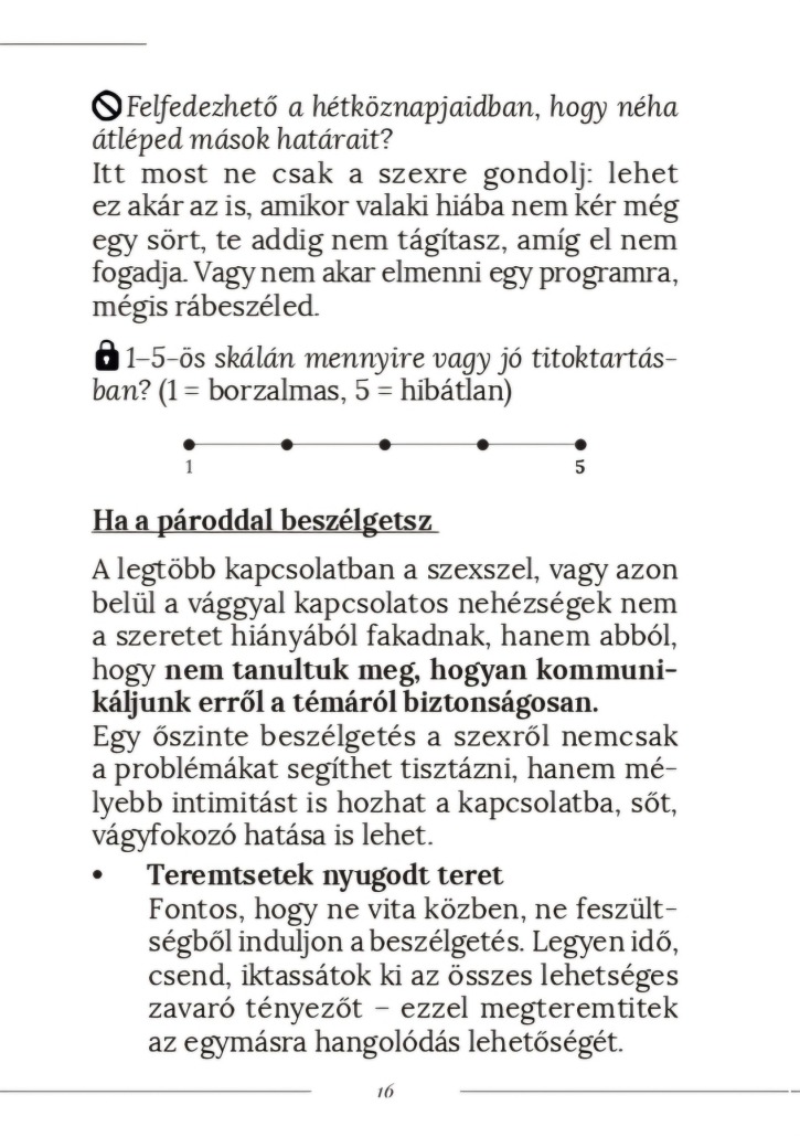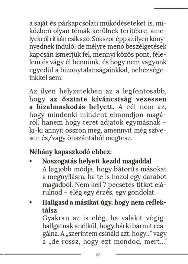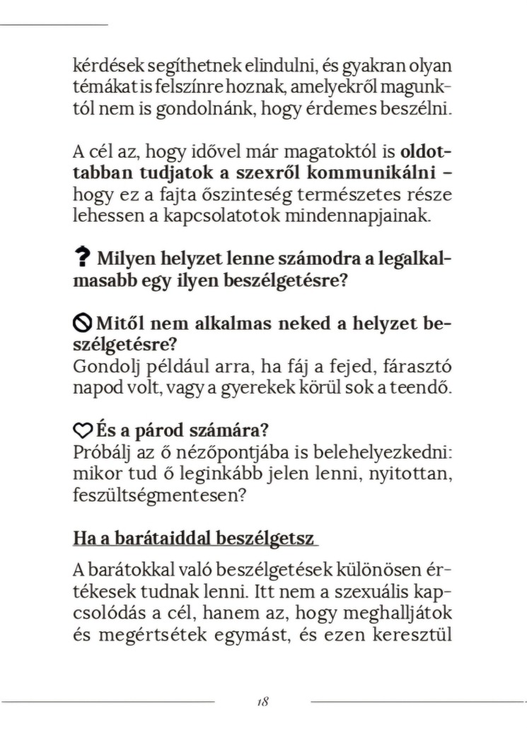 Ebbe a kisméretű füzetkébe rengeteg gyakorlati útmutatást sűrítettem – arról, hogy mitől lesznek a beszélgetések biztonságosak és valóban intimek, és arról is, mit kezdhettek a felmerülő gátlásokkal és szégyenérzettel. És még a jegyeteidnek is van benne hely.