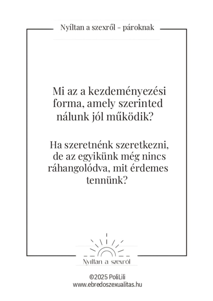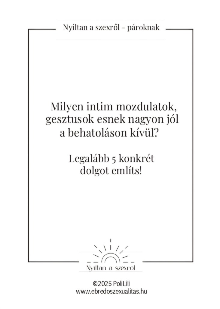 A kérdésgyűjtemény abban támogat titeket, hogy könnyebben megnyíljatok egymás előtt. Segítségükkel a szégyenlősséget és a kínos helyzeteket kíváncsiságra és pajkosságra cserélhetitek, miközben felfedezitek, mi ad valódi örömet számotokra a szeretkezésben.