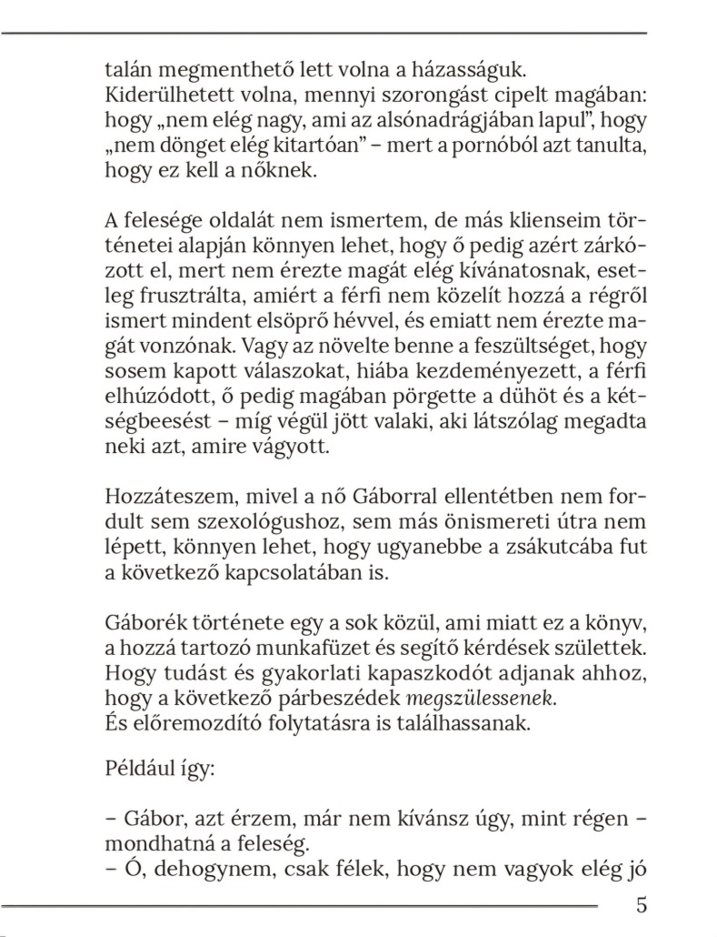 „Végre beszélgetni kezdtünk – nem csak a szexről, hanem arról is, amit eddig csendben cipeltünk. Már nem muszájból érünk egymáshoz, hanem vágyból, kíváncsiságból, játékból. A mindennapokban újra ott van a suttogás, az érintés.”
